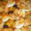 - Retire do forno e decore com ovos cozidos às rodelas ou picados, salsa picada e azeitonas pretas.